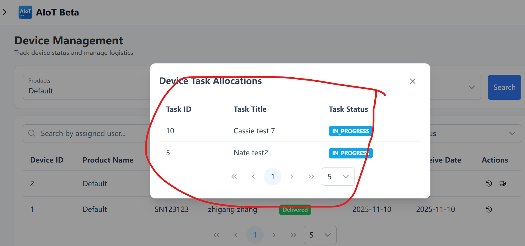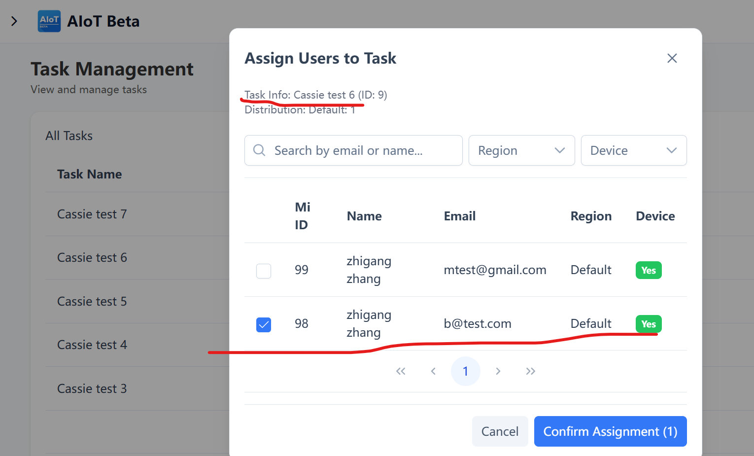 98 is assigned to Cassie test 6, but in Device Task Allocations, there is no Cassie test 6